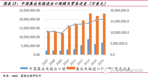 國內(nèi)需求充足,進(jìn)口替代空間巨大。中國集成電路市場規(guī)模雖然大,但不可回避的問題是其自給率偏低。據(jù)海關(guān)統(tǒng)計,2015 年中國集成電路進(jìn)口金額比去年同期增長6%,達(dá)到2307億美元,而出口金額為僅為693.1億美元,進(jìn)出口逆差仍然有1613.9億美元,這表明國內(nèi)有極大的進(jìn)口替代空間。