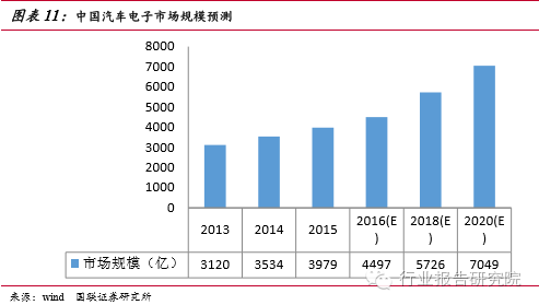 汽車電子類產(chǎn)品通常落后消費類電子產(chǎn)品一個時期,正如過去幾年手機(jī)行業(yè)所經(jīng)歷的那樣,汽車業(yè)正在由“功能機(jī)”向“智能機(jī)”發(fā)展,這將給電子行業(yè)帶來新的增長引擎。受惠于各國汽車安全政策加持,近期汽車電子輔助行車安全的趨勢已十分明確,越來越多類似TPMS、倒車影像、自動剎車系統(tǒng)等新應(yīng)用崛起。各大車企、互聯(lián)網(wǎng)公司紛紛加快在車聯(lián)網(wǎng)和自動駕駛領(lǐng)域的產(chǎn)業(yè)布局,車聯(lián)網(wǎng)有望成為第一個實現(xiàn)的物聯(lián)網(wǎng)應(yīng)用空間廣闊,存量與增量汽車市場規(guī)??捎^。2015 年中國汽車電子市場規(guī)模為3,979億元,同比增長12.6%,2013~2015年中國汽車電子市場規(guī)模平均增長率為13.7% 。中商產(chǎn)業(yè)研究院預(yù)測2016年中國汽車電子市場規(guī)模為4497億元。賽迪顧問預(yù)計到2016年中國汽車電子市場將保持 10%以上的增速,同時汽車電子在整車成本中的占比將超過50% 。我們判斷中國汽車電子市場增長方式正在由汽車產(chǎn)量增長轉(zhuǎn)向功能需求驅(qū)動。