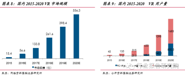 下一代計算平臺,顛覆眾多傳統(tǒng)領(lǐng)域。預(yù)計2016年國內(nèi)VR市場增長了近四倍, 之后的增速雖然有所減緩,但是市場的規(guī)模成倍增加。到2020年,市場規(guī)??梢赃_(dá)到556億元,用戶量達(dá)到2500萬,其中PC端用戶量將會突破850萬人,移動端將會達(dá)到1683萬人,出貨量達(dá)到820萬臺,其中PCVR一體機(jī)的出貨量170 萬臺,移動VR出貨量750萬臺,移動端的VR市場爆發(fā)的更加的迅速,市場潛力更大。