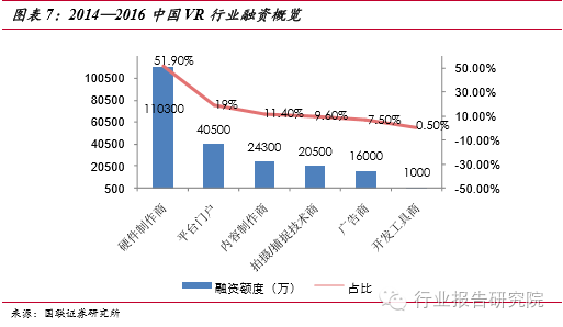 蓄勢待發(fā),爆發(fā)潛能驚人。VR 硬件包括輸出設(shè)備如 PC 端顯示頭戴,移動端顯 示頭戴,以及輸入設(shè)備如手柄,跑步機(jī),動作捕捉識別設(shè)備,全景相機(jī)等。國內(nèi)目前融資最大的一塊就是硬件制作商,占比達(dá)到 51.9%,這也說明了國內(nèi)的 VR市場還處在初期,國外的VR已經(jīng)形成了產(chǎn)業(yè)化,國內(nèi)的市場雖然處于初期但是成長的潛力確實非常大的。